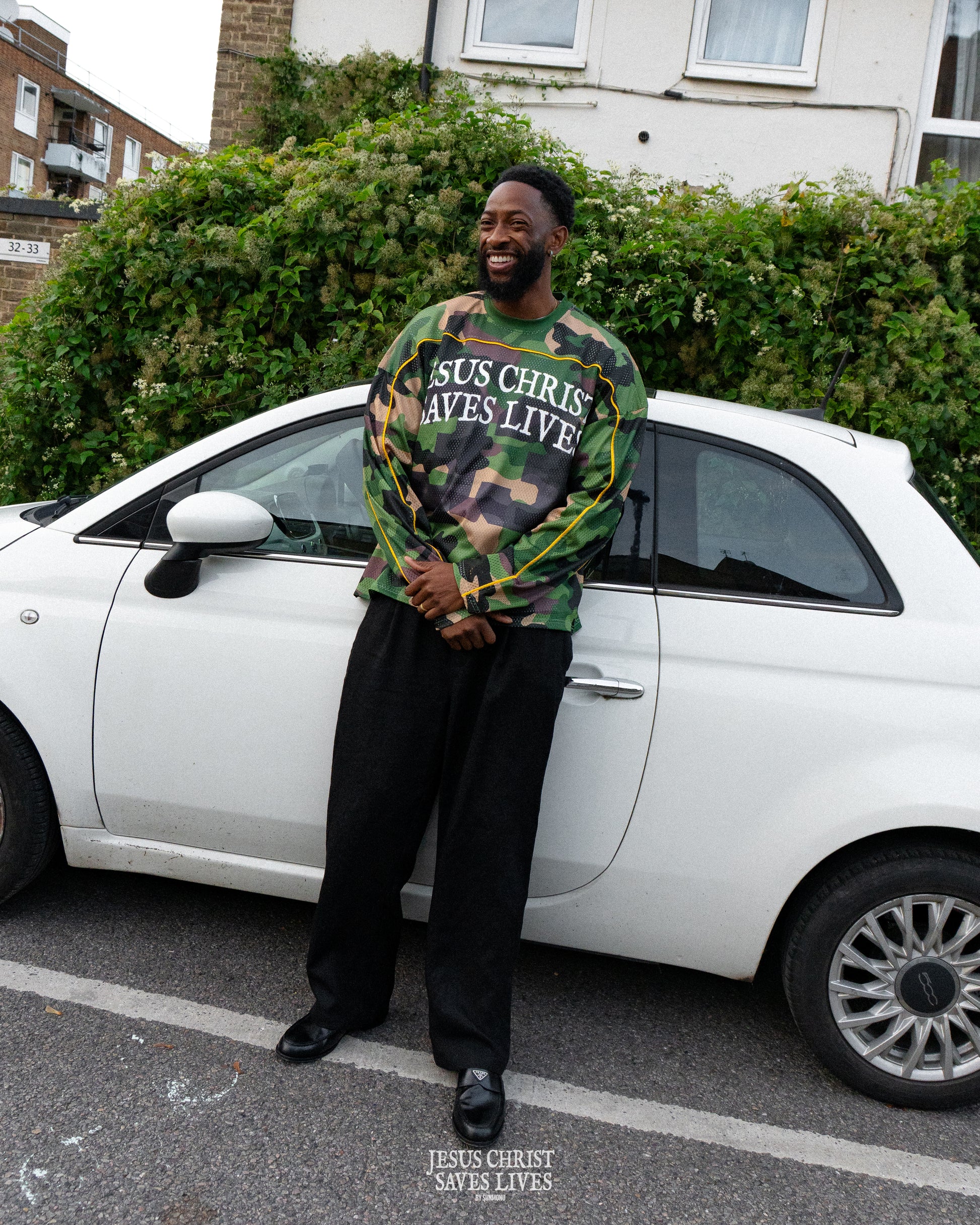 The jersey is oversized, featuring a high-ribbed collar, dropped shoulders and a slight crop.